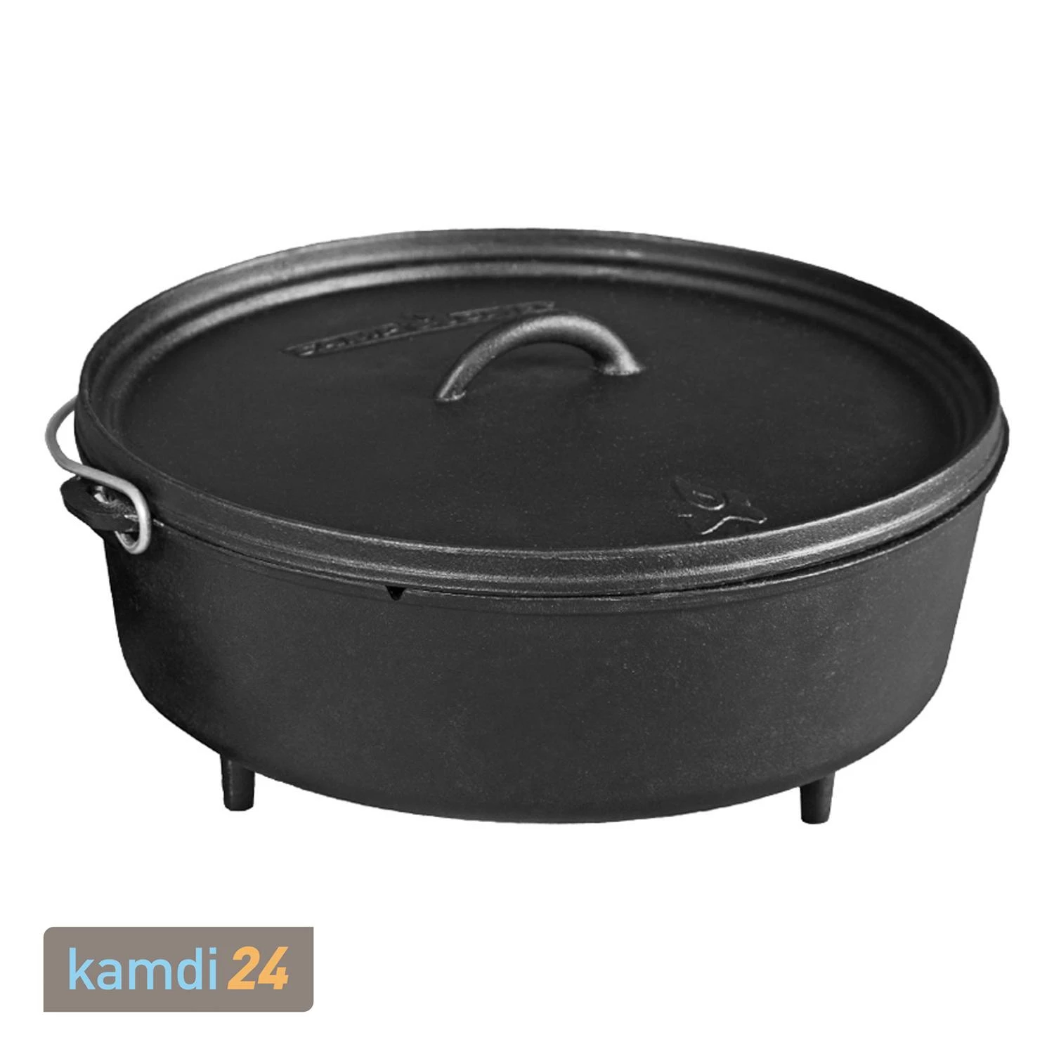 Der eignet sich nicht nur zur Zubereitung von Suppen oder Eintöpfen – Sie können darin nahezu alle denkbaren Gerichte kochen, braten, backen oder grillen. Der dicht schließende Deckel ermöglicht einen Backofen- und Schnellkochtopf-Effekt, wenn Sie darauf glühende Kohlen platzieren. Die gleichmäßige Wärmeverteilung in den massiven Gusseisen-Wänden sorgt für kurze Garzeiten.