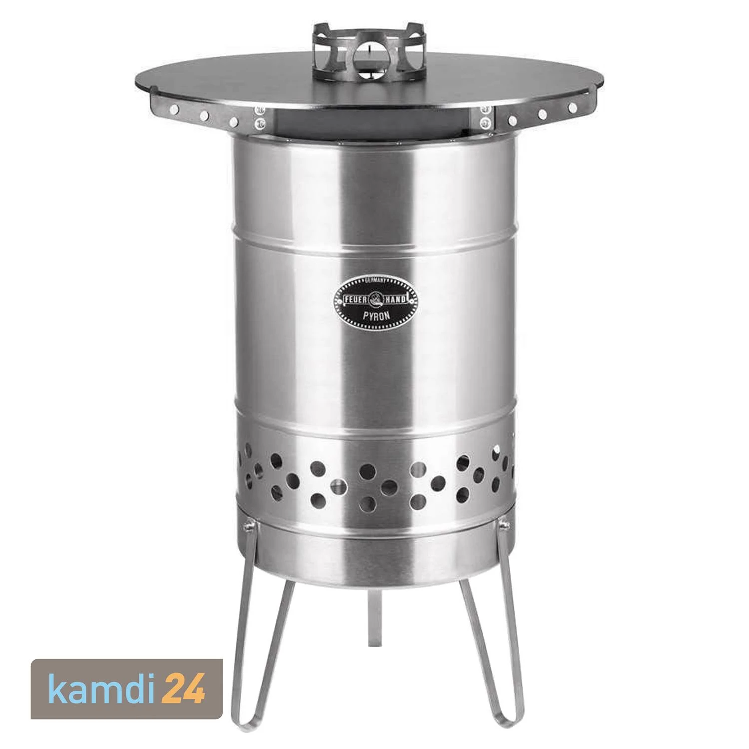 Durch die Öffnung im Kochaufsatz bzw. in der ist auch das Nachlegen von Brennholz gefahrlos möglich. Da die sich bei der ersten Benutzung ein wenig nach innen wölbt, fließen Grillsäfte nicht außen über den Rand, sondern immer nach innen ins Feuer. Das saubere Grillen von Würstchen, Steaks, Käse und Gemüse, aber auch das Braten von Eiern oder Pancakes ist mit der auf der Feuertonne Pyron von Feuerhand somit ein Kinderspiel.
