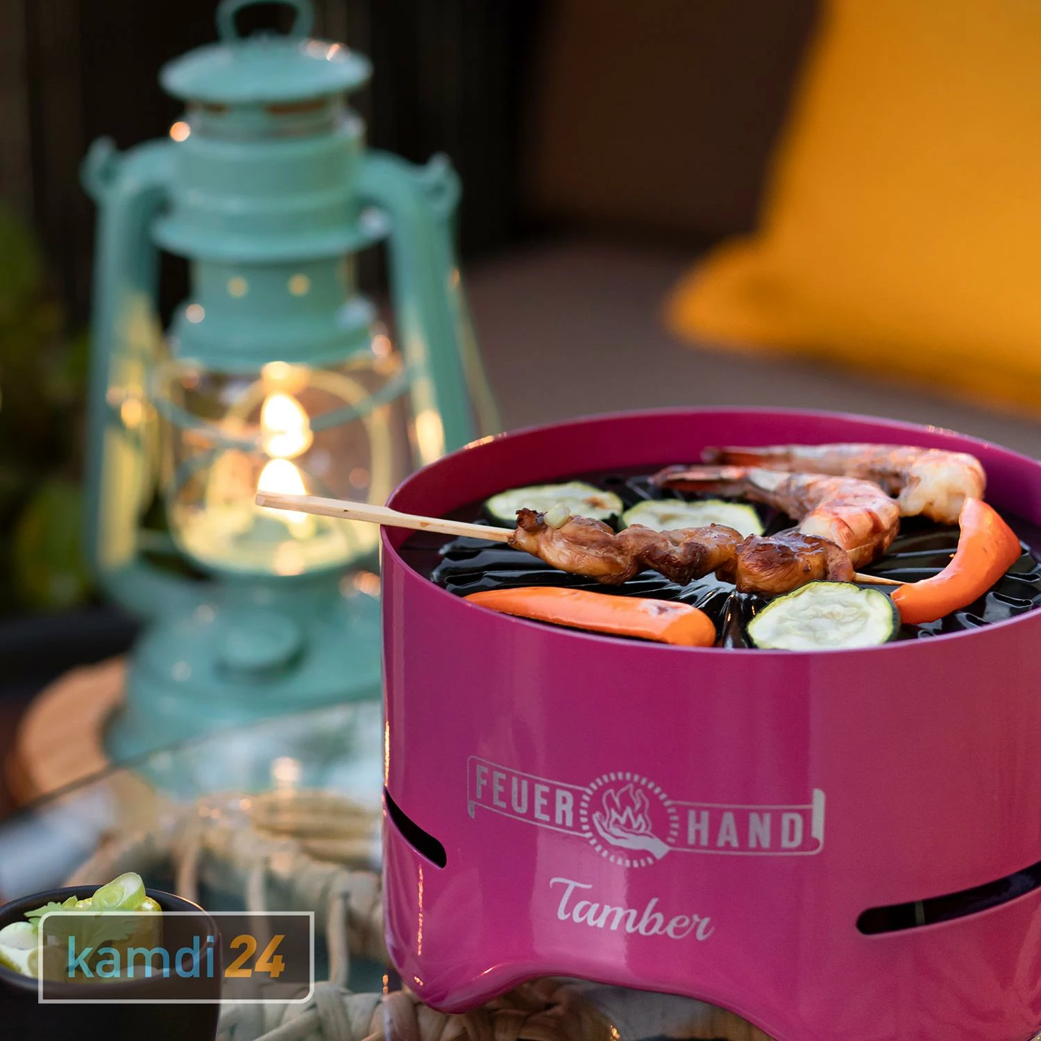 Mit einer Füllung ist der Tamber in 15 bis 20 Minuten betriebsbereit und Sie können bis zu 1,5 Stunden grillen. Der Tamber lässt sich nach dem Grillen leicht auseinandernehmen und reinigen. An dem emaillierten Grillrost haften keine Speisen an. Er ist zudem spülmaschinengeeignet. Nach dem Grillen bietet der Tamber-Deckel die passgenaue Stellfläche für die , die Sie zusätzlich erwerben können, und am späten Abend Ihren Tisch erhellt.