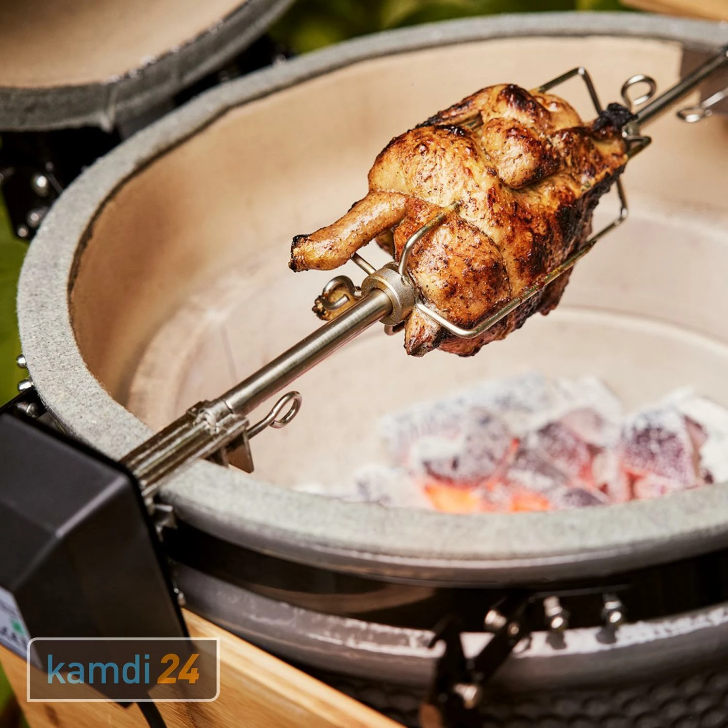 Der Drehspieß wird von einem Motor angetrieben und besitzt große Klauen zum Fixieren des Grillguts. Er eignet sich für die Kamado-Grills , und von Grill Guru.