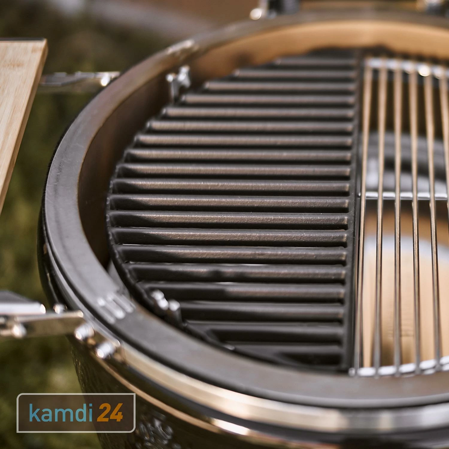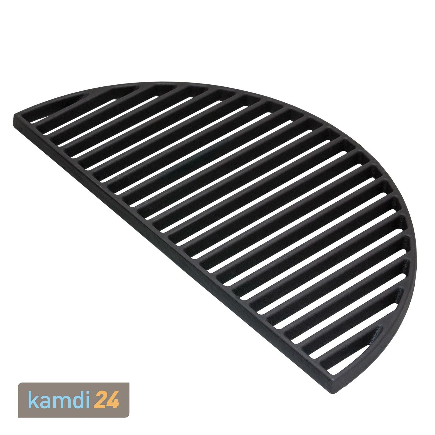 Der halbmondförmige Rost aus Gusseisen von wird gern genutzt, da dieser die Hitze besser speichert und gleichmäßiger abgibt als Edelstahl-Roste. Zudem erhält das Grillgut auf dem Gussrost die perfekten Grillstreifen.