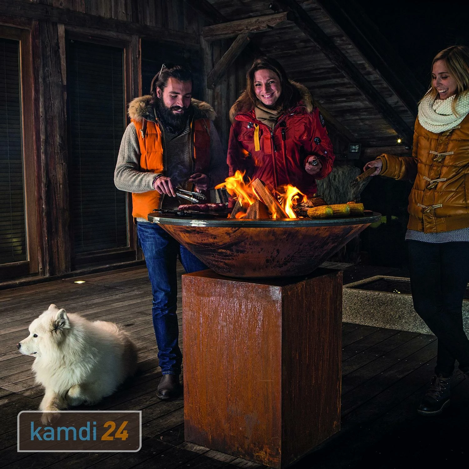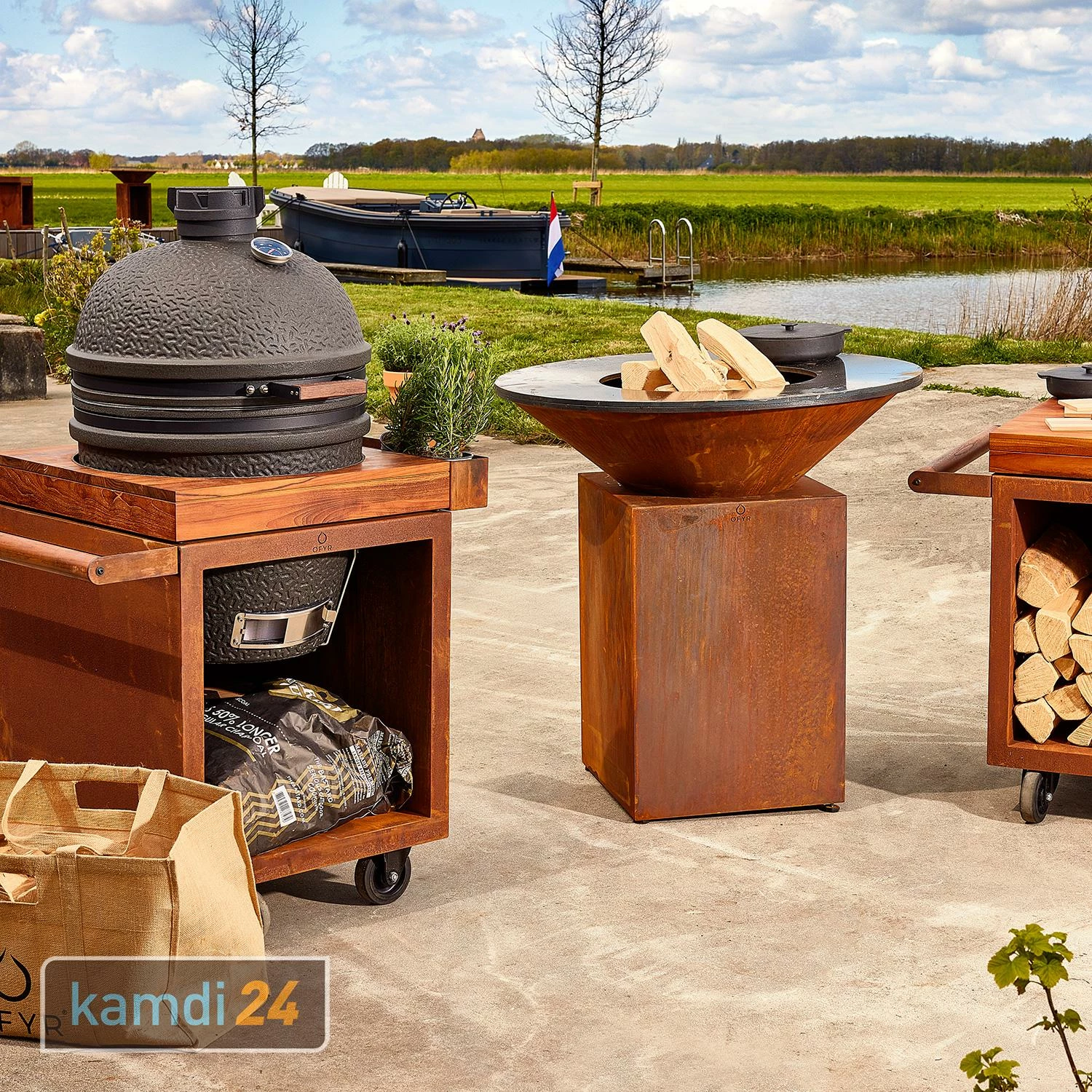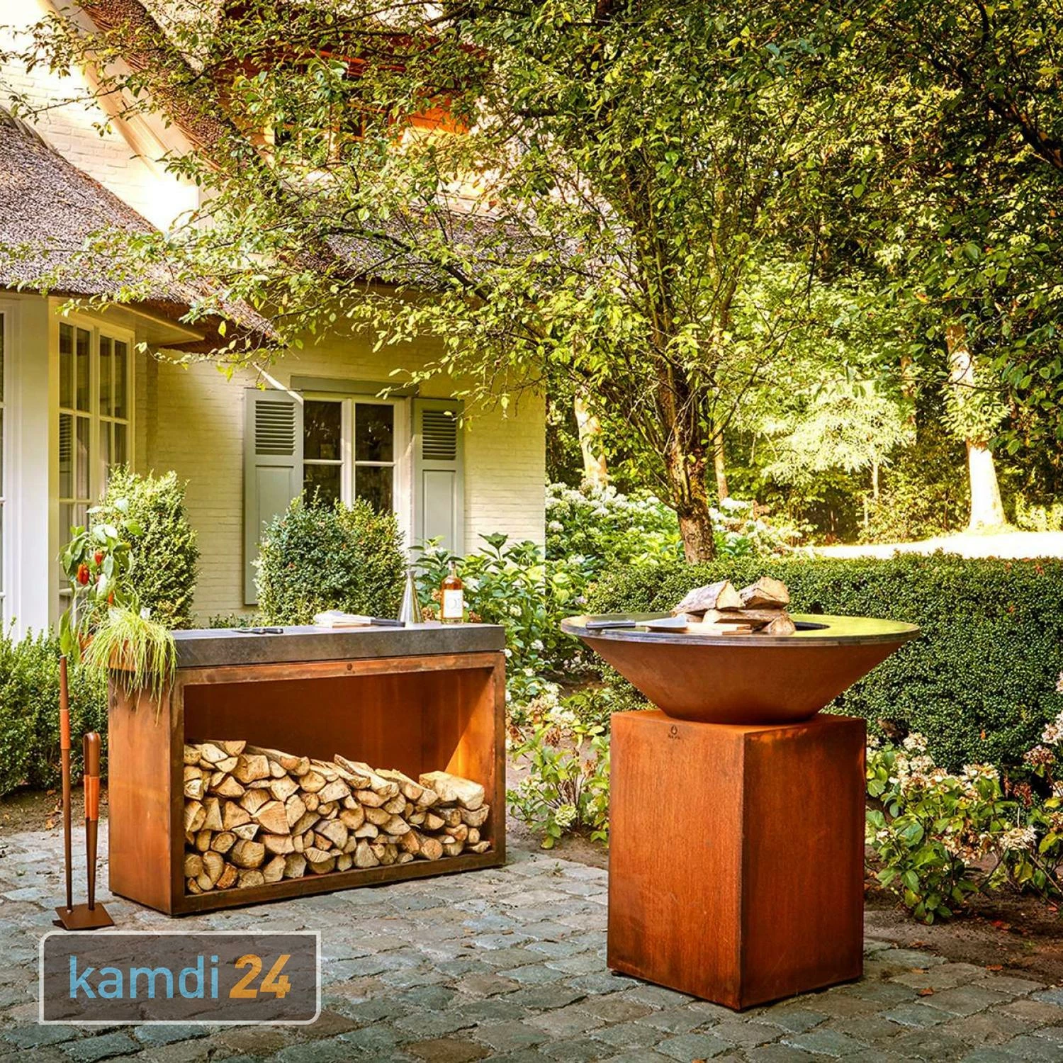Mit einer großen Auswahl an in verschiedenen Farben und Größen mit oder ohne Holzfach, Arbeitsplatte und Räder präsentiert sich die niederländische Marke . Grillfans kommen dabei voll auf ihre Kosten, um gemeinsam die Outdoor-Küche neu zu entdecken. Dabei soll nicht mehr nur einer allein am Grill stehen, so die Philosophie des Herstellers. Die sind entsprechend rund und für kleine und große Feiern geeignet. Die macht dabei keine Ausnahme: Mit einer Kochplatte von Durchmesser können 10-12 bzw. 15-20 Personen bewirtet werden. Nach dem Essen oder an kalten Tagen ist die Verwendung nicht zu Ende, denn angezündete Holzscheite in der Mitte sorgen für Wärme und Licht.