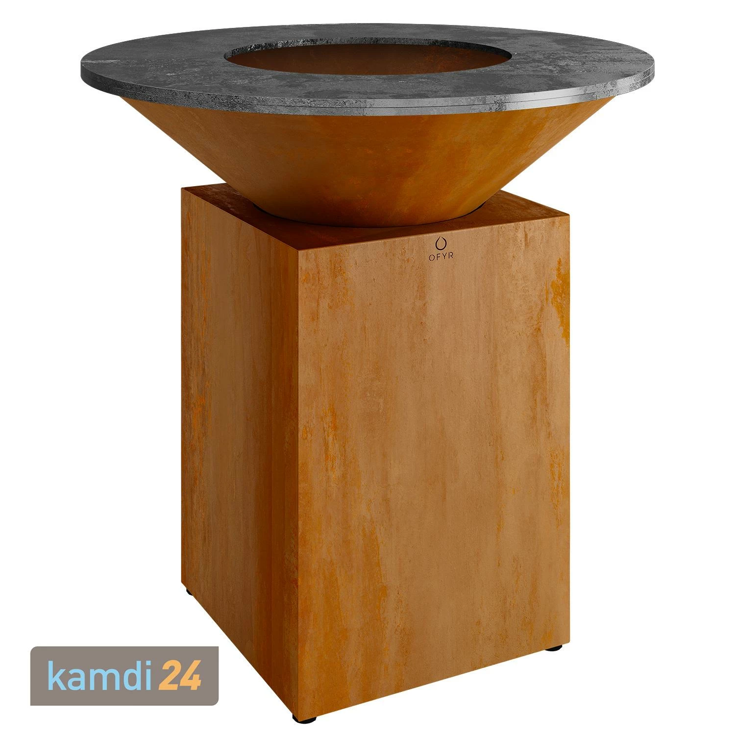 Kegel und Sockel bestehen entweder aus hellem Cortenstahl oder schwarz beschichtetem Stahl. Cortenstahl ist wartungsärmer, hinterlässt aber sichtbarer Fettspritzer vom Grillen. Die schwarze Beschichtung ist sehr hochwertig, jedoch anfälliger für Kratzer, verwenden Sie hier bei der Lagerung unbedingt eine Abdeckung. Gemeinsam mit dem passenden Durchmesser der Kochplatte wählen Sie Ihren Favoriten im Varianten-Menü aus.