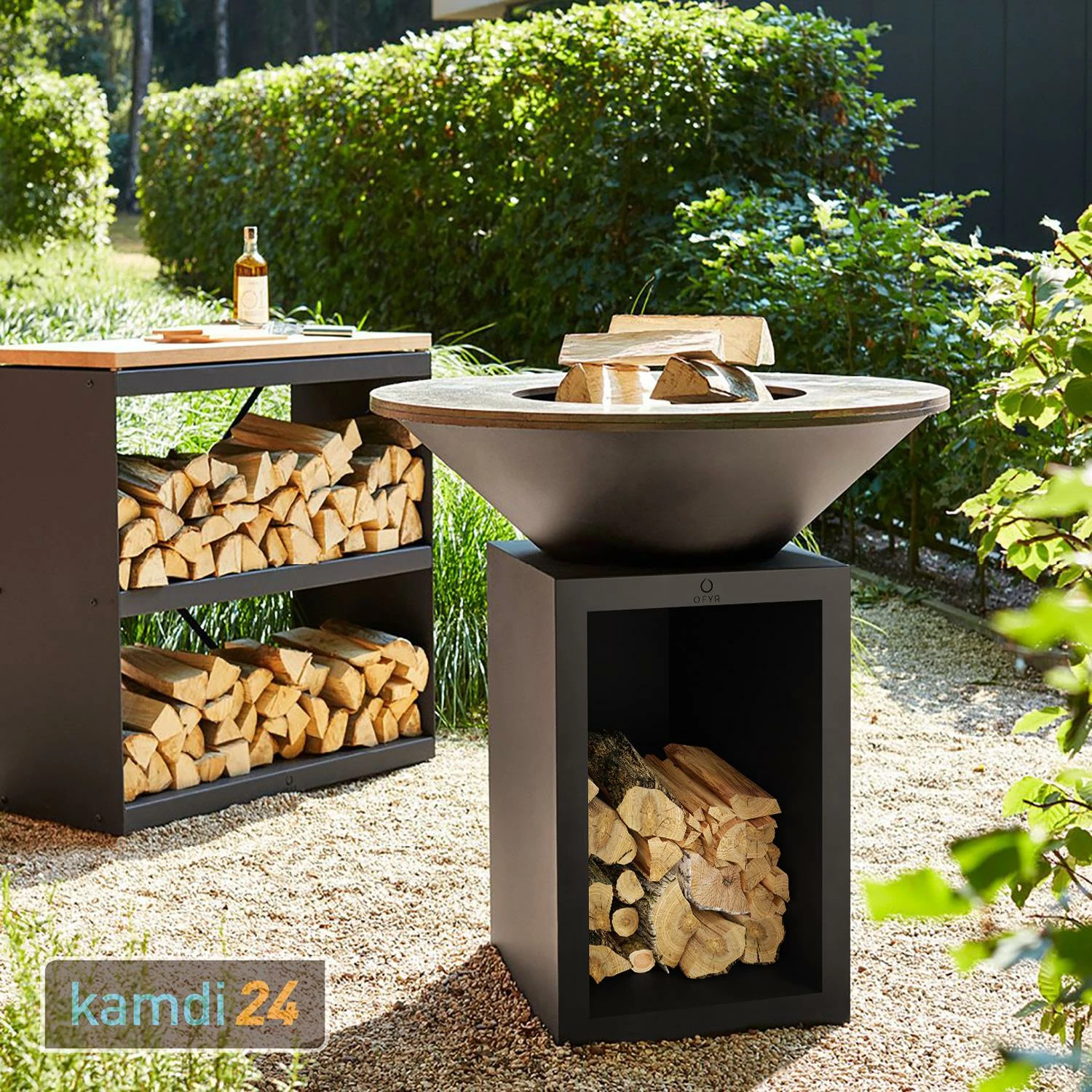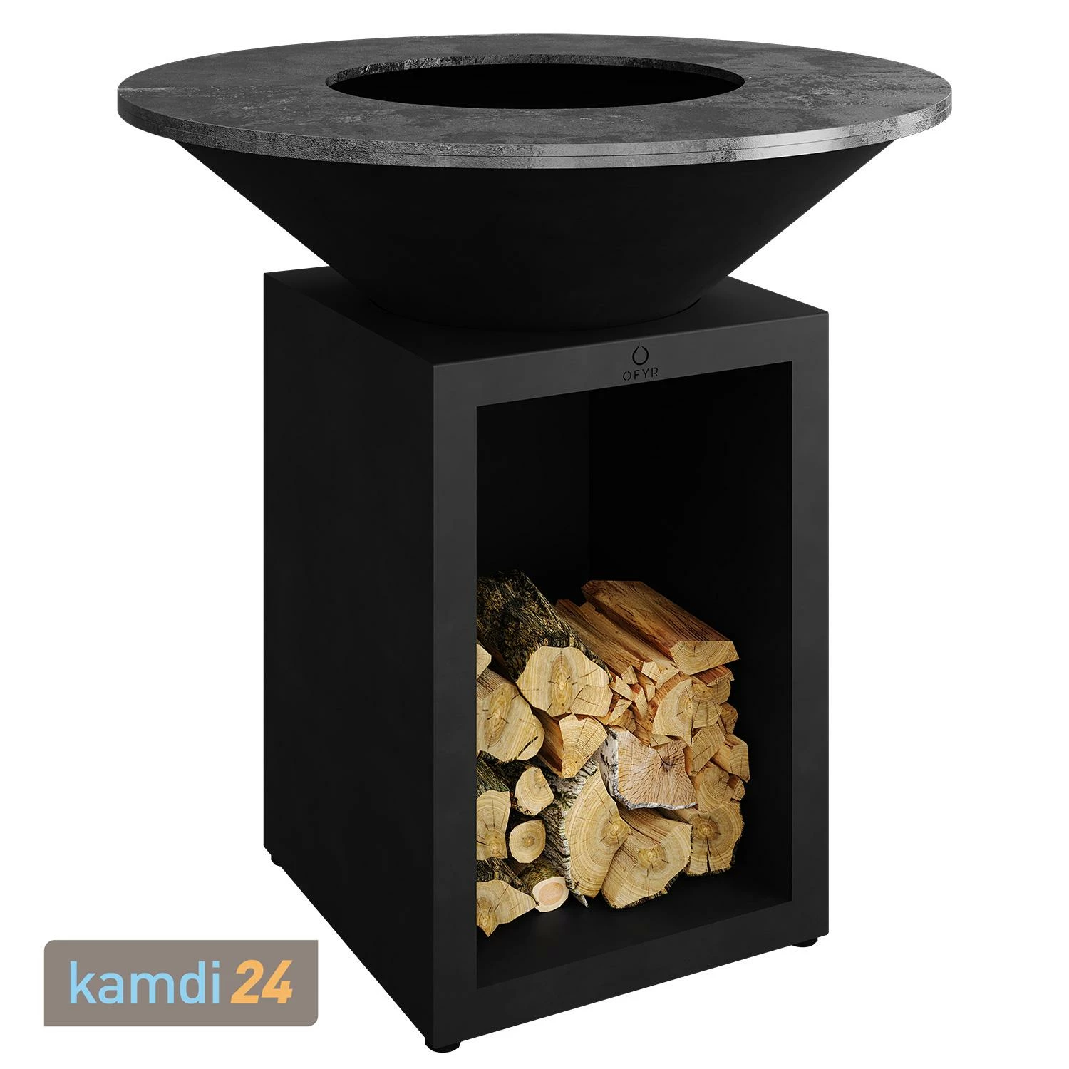 Der Sockel ist an einer Seite offen und ermöglicht die Lagerung des Brennholzes direkt dort, wo Sie es benötigen. Während des Grillens muss auf einen etwas 20 cm großen Freiraum zwischen Holz und den heißen Bestandteilen geachtet werden.