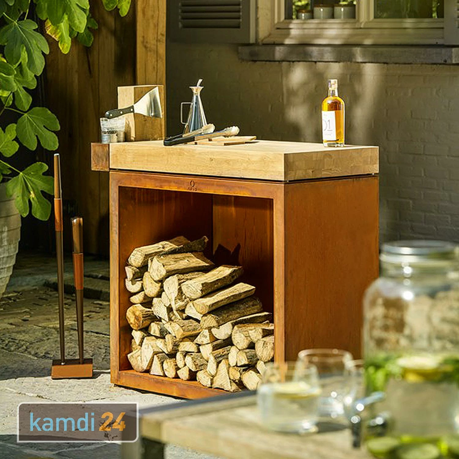 Das offene Fach im Sockel bietet mit ausreichend Platz für Ihren an. Über die gesamte Breite geht eineaus Keramik oder Teakholz – bestimmen Sie Ihren Favoriten einfach über das . Zum Schneiden des Grillgutes empfiehlt sich ein extra Brett.