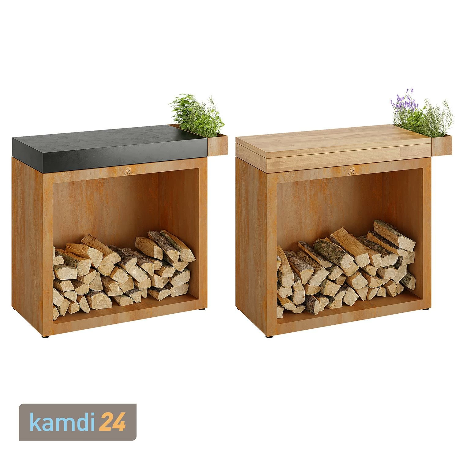 Der Sockel ist an einer Seite offen und ermöglicht die Lagerung des Brennholzes direkt dort, wo Sie es benötigen.