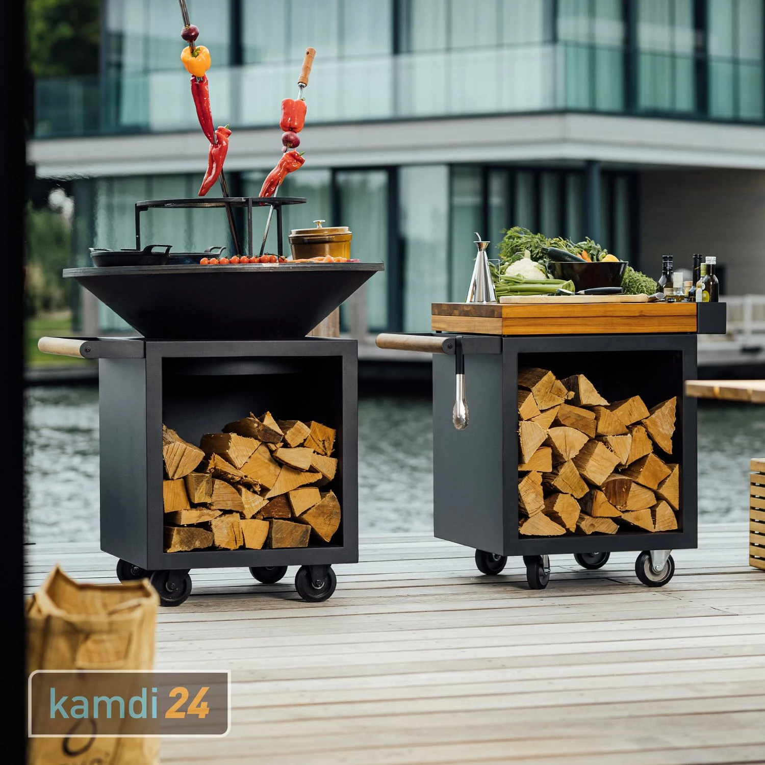 Die Sockel erhalten Sie in zwei unterschiedlichen Breiten: mit 65 oder 135 cm – wählen Sie Ihren Favoriten mit der gewünschten Arbeitsplatte im Varianten-Menü aus. Das kleine Modell ist handlicher zu bewegen und reicht für kleine Grillrunden aus. Mit dem größeren Modell haben Sie Platz, um mit mehreren Personen Speisen vorzubereiten. Allerdings ist dieser Sockel, insbesondere mit gefülltem Holzvorrat, schwerer zu bewegen.