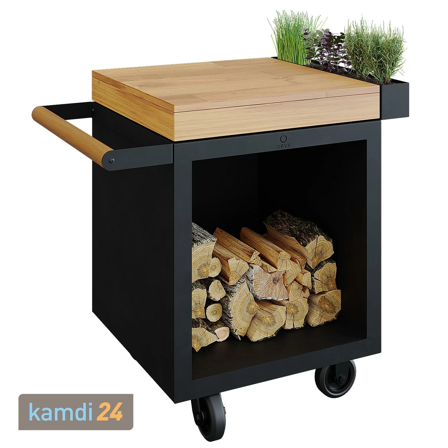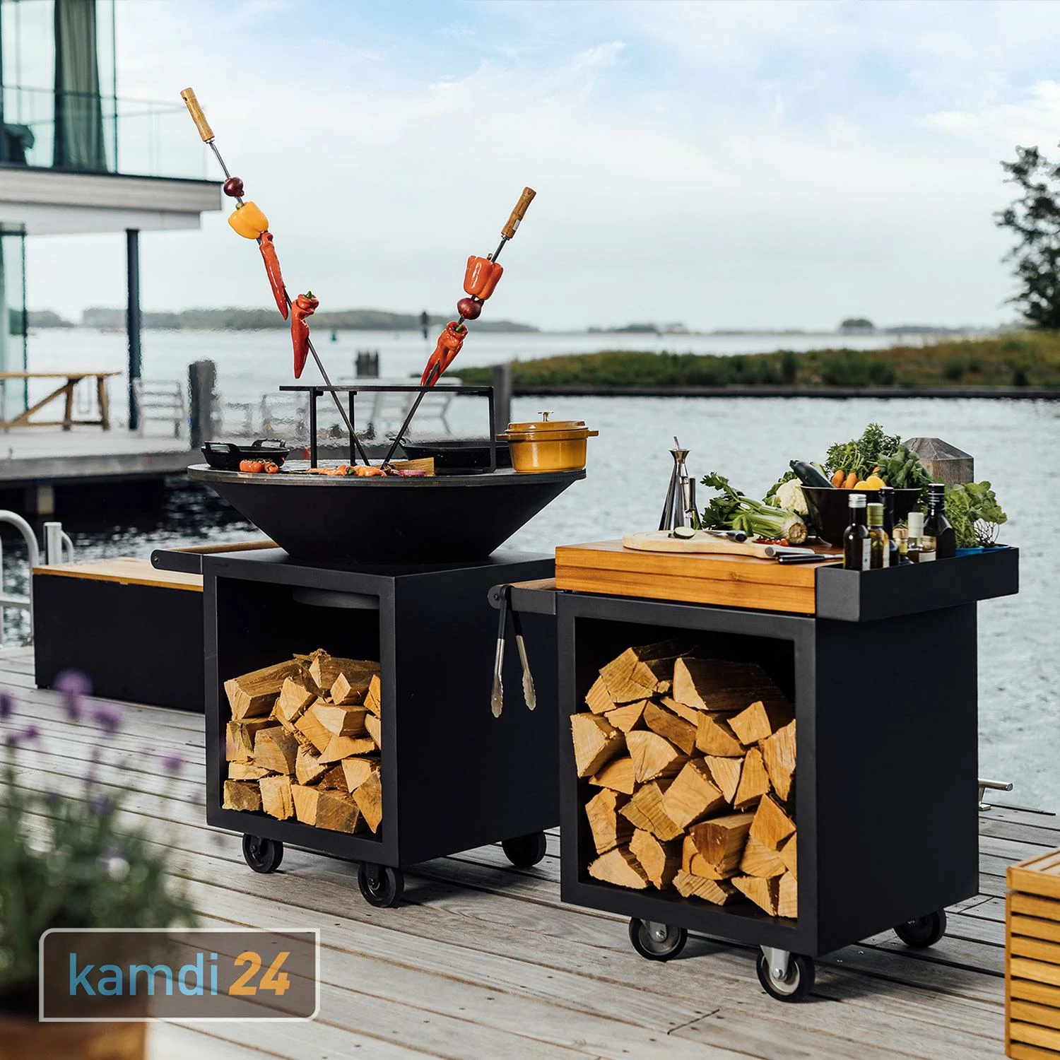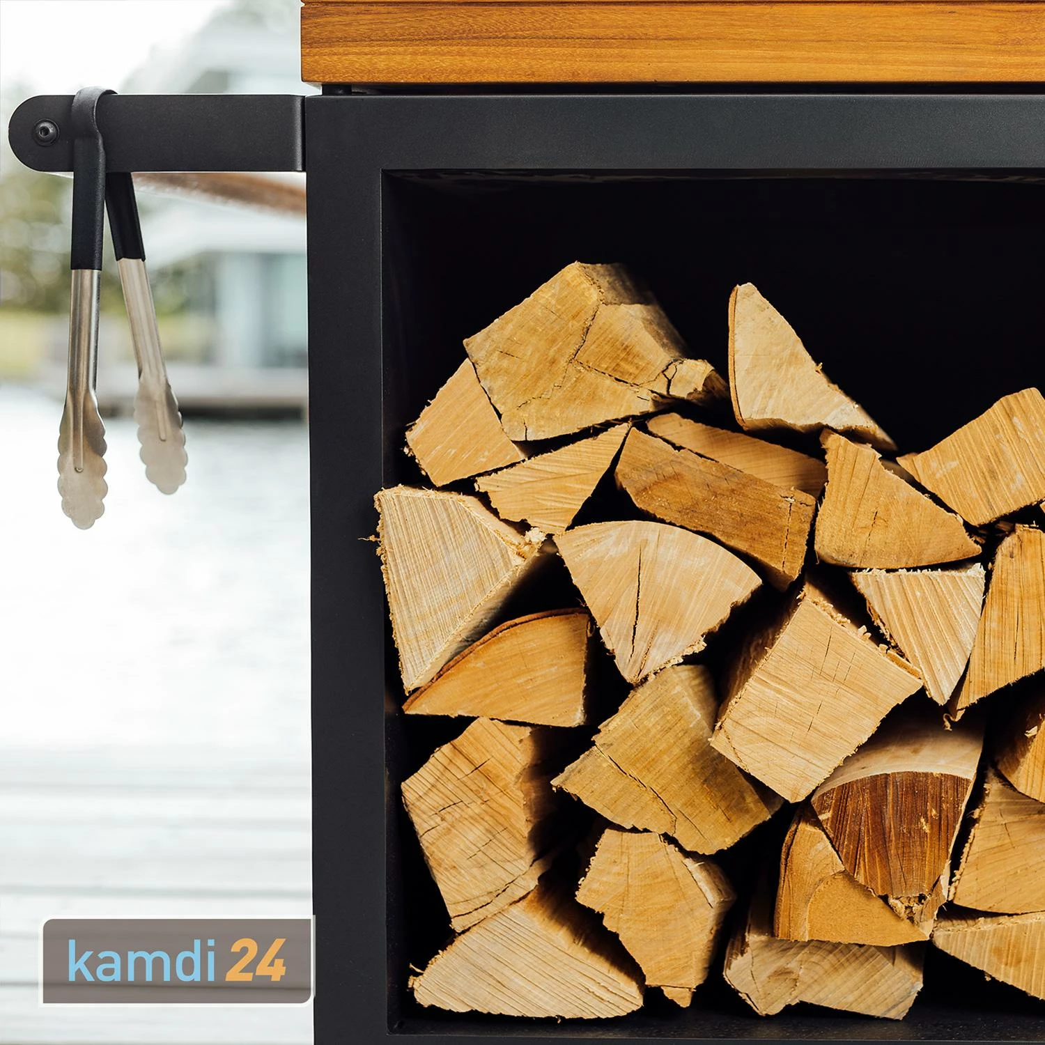 Ein im Sockel bietet viel Platz für Ihren Brennvorrat. Beachten Sie bei voller Holzbefüllung, dass die kleineren Modelle leichter zu bewegen sind als die Größeren. Der Sockel kann mithilfe von vier an beliebigen Stellen platziert werden. An einer Seite befindet sich ein, an dem ein Handtuch oder Grillbesteck angebracht werden kann und auf der anderen Seite ein für wie Speiseöl oder Gewürze.