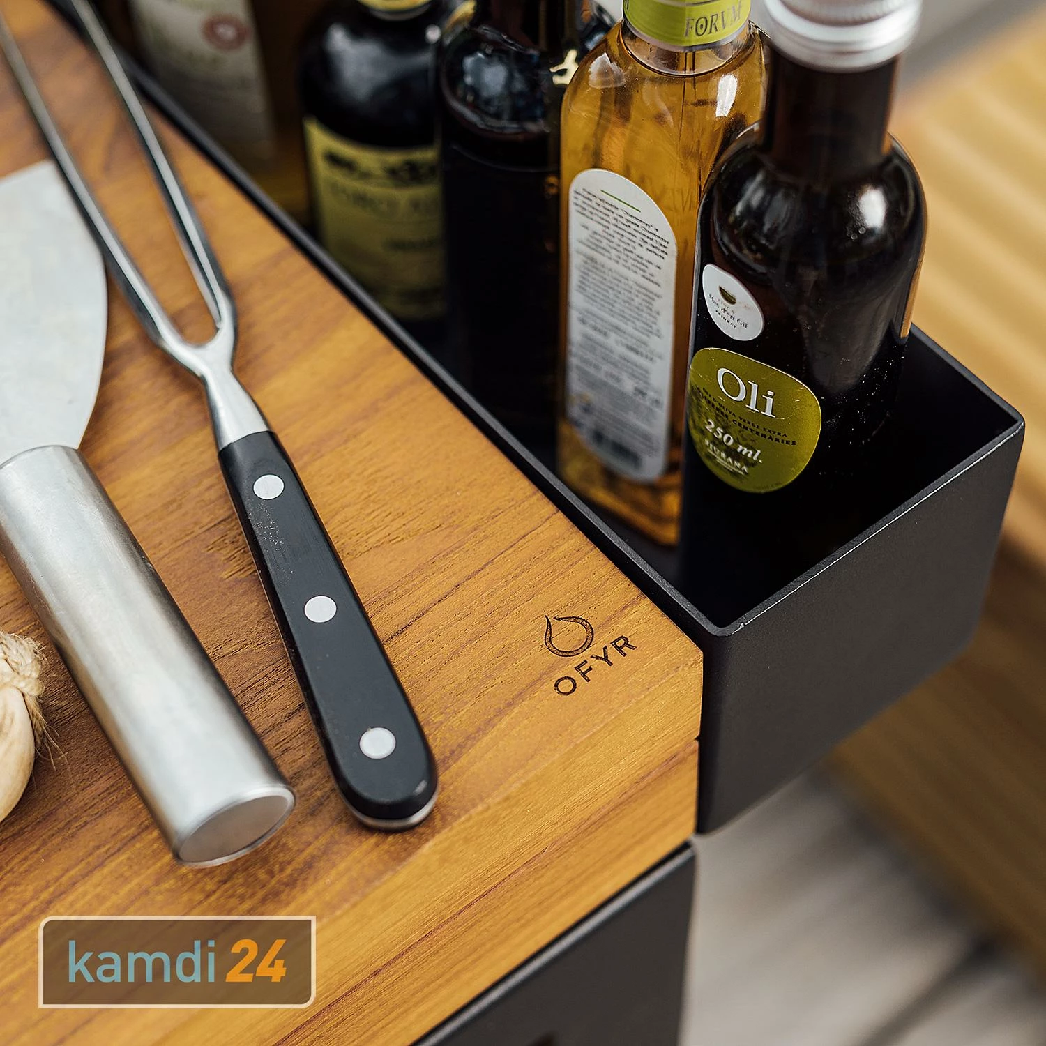 Die quadratische Arbeitsplatte besteht aus dunkelgrauer Keramik oder hellen Teakholz. Keramik ist witterungsbeständiger, kann jedoch Messer stumpf machen; Teakholz ist robuster, muss aber trocken gelagert werden. Verwenden Sie auf beiden Materialen am besten ein geeignetes Schneidebrett, wenn Sie die Lebensmittel zubereiten. Zusätzlich gibt es ein schmales Ablagefach für Gewürze, Kräuter und Grillzubehör.