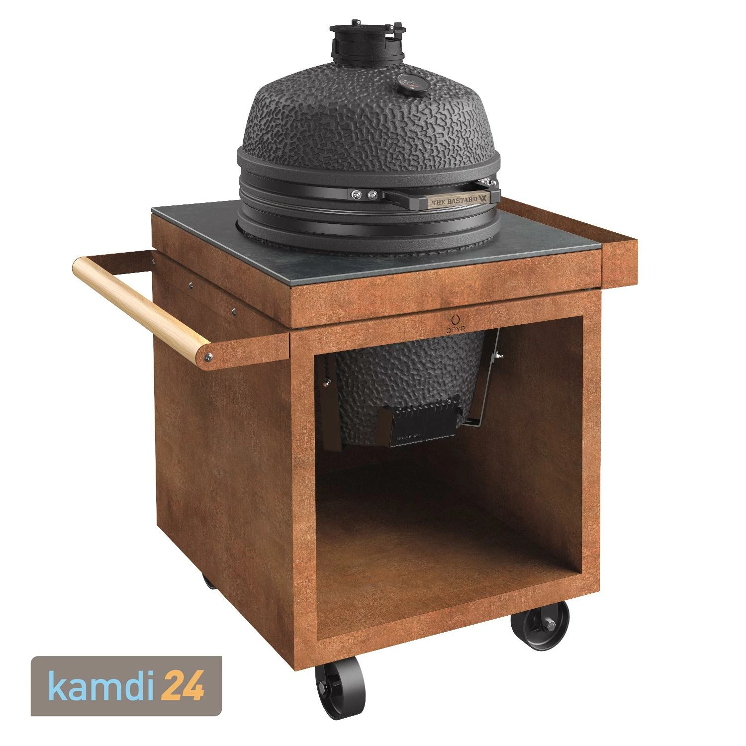 Unter dem Kamado kannst du das Holz lagern. Der Sockel besteht ausund ist mit einer ausgestattet. Aufgrund eines chemischen Prozesses weist Cortenstahl auf seiner Oberfläche eine Schutzschicht auf, die im Vergleich zu anderen Stahlsorten seine Beständigkeit gegen atmosphärische Korrosion erhöht. Die schützt vor Oxidationsbohrungen.