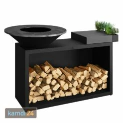 Die sind an einer Seite offen und ermöglichen die Lagerung des Brennholzes. Durch den Einsatz des Kamado-Grills ist der Stauraum jedoch begrenzt.