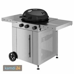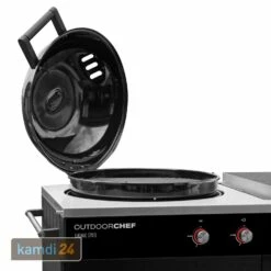Auch optisch hat sich Outdoorchef mit der selbst übertroffen. Schlicht, elegant und hochwertig ähnelt sie eher einer hochmodernen Küche als einer Grillstation. Eine in Glas eingefasste Bedieneinheit mit , und erzeugen eine ganz besonders hochwertige Optik. Der pulverbeschichtete Unterbau bietet genügend Stauraum für und weiteres Zubehör. , zwei davon mit Bremsfunktion, ermöglichen ein problemloses Verschieben der Grillstation.