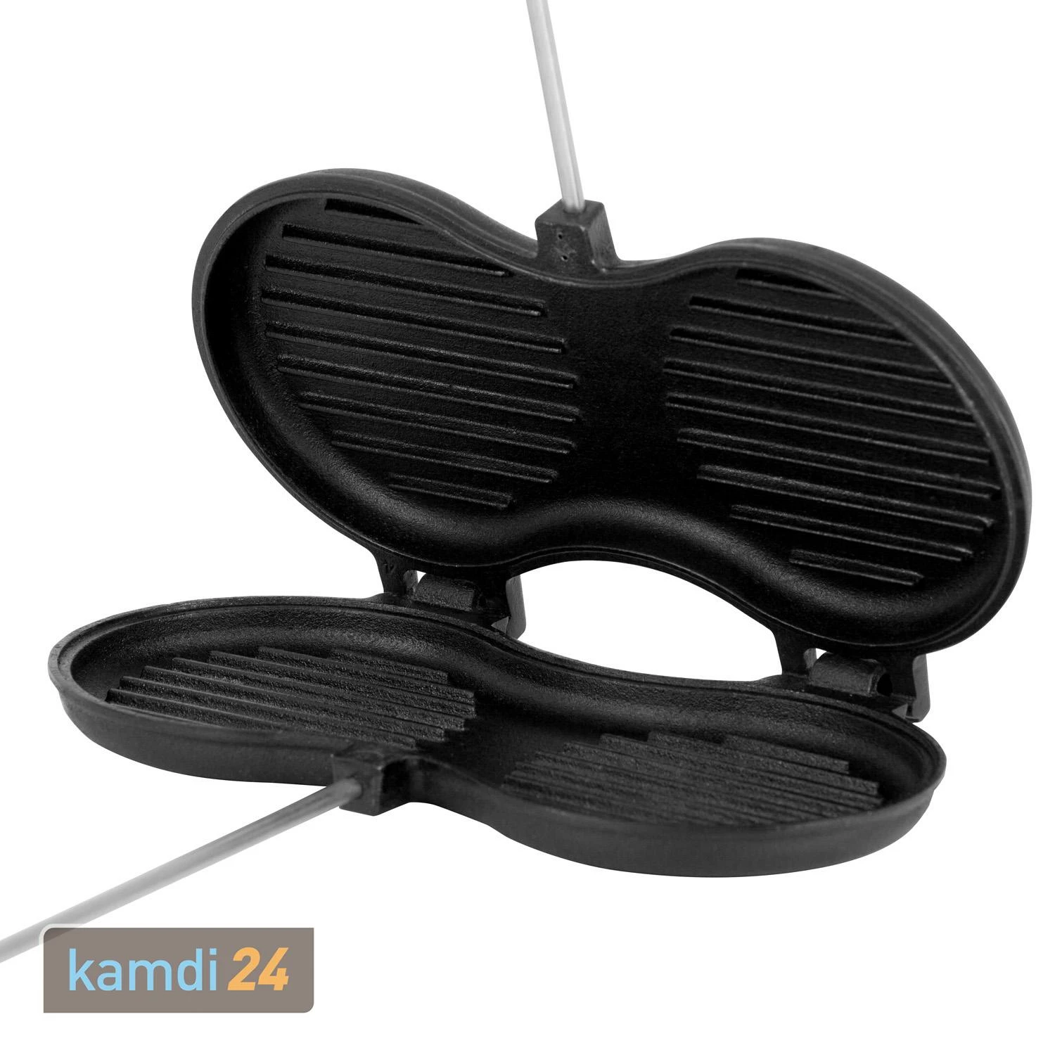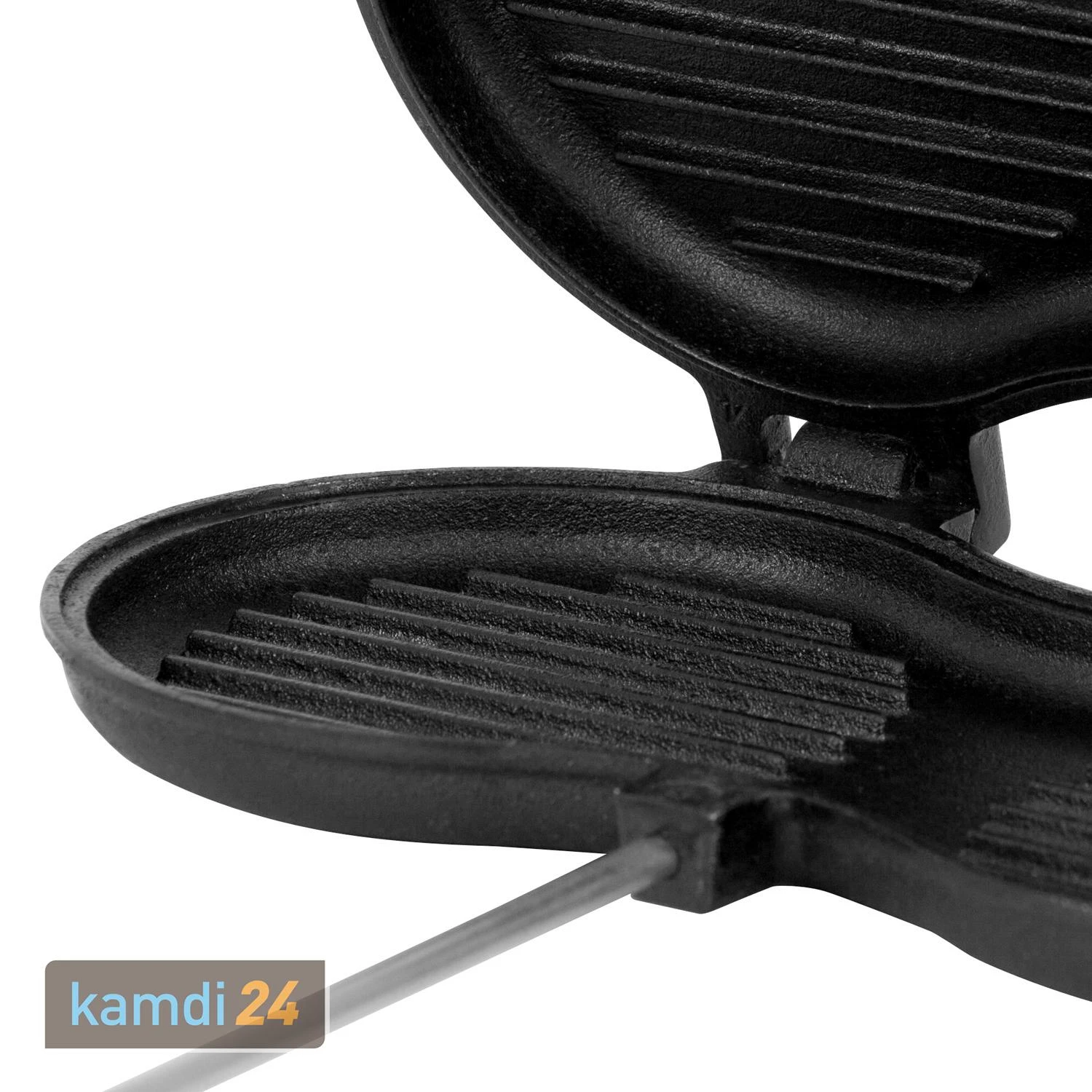 Burgerpattys aus dem Lagerfeuer? Mit dem von ist das kein Problem! Die ist auf den Innenseiten geriffelt, sodass die Pattys das typische bekommen. Da Gusseisen ein sehr guter Wärmeleiter und -speicher ist, werden die Pattys im Burgereisen zunächst scharf im Feuer angebraten und dann mit der Restwärme durchgegart. So erhalten Sie perfekte Burgerpattys, die außen kross und innen saftig sind.