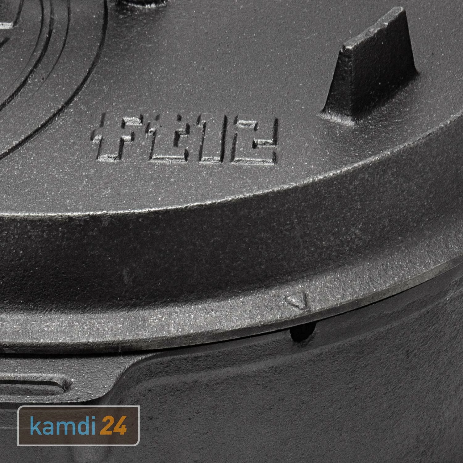 Auf dem Deckel von befinden sich drei gusseiserne Füße, die einerseits das Stapeln der Feuertöpfe ermöglichen und andererseits den Deckel zur Grill- und Servierplatte machen.