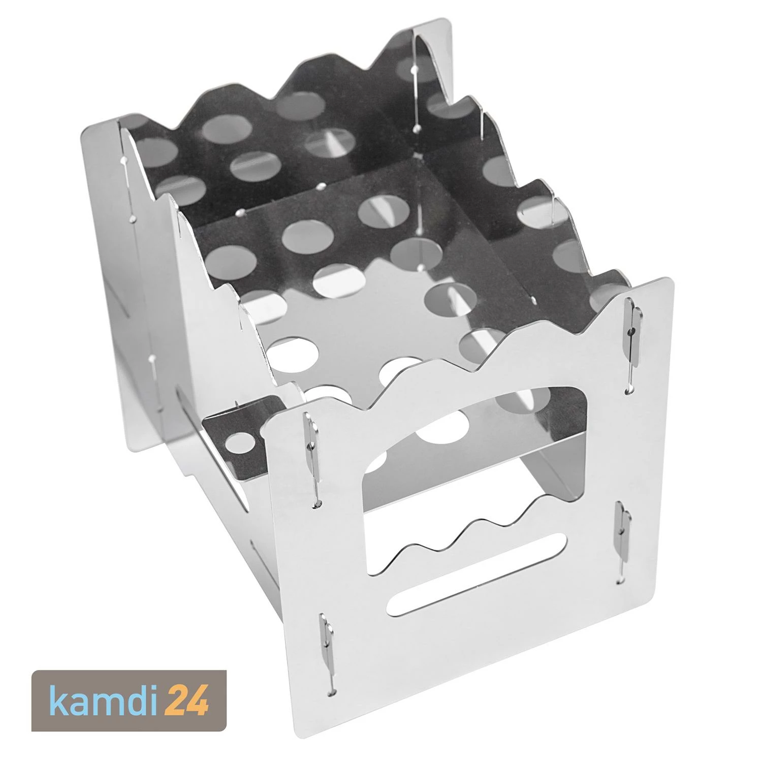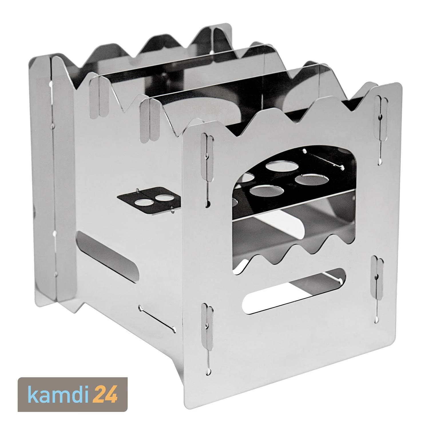 Luftschlitze am Boden ermöglichen eine äußerst effiziente Verbrennung durch die gezielte Nutzung des Kamineffektes. Je nach Brennstoff wird der Bodenrost in zwei Höhen arretiert: Setzen Sie ihn in die untere Ebene, wenn Sie Kleinholz, Reisig oder Rinde verbrennen möchten und einen entsprechend großen Brennraum benötigen. In diesem Fall kann der Brennstoff bequem über die Öffnung an der Frontseite des nachgelegt werden. Alternativ lässt sich der Rost in der oberen Ebene einsetzen, um einen Spirituskocher, Trockenbrennstoff-Tabletten oder Teelichter zur Befeuerung des Kochers zu verwenden.