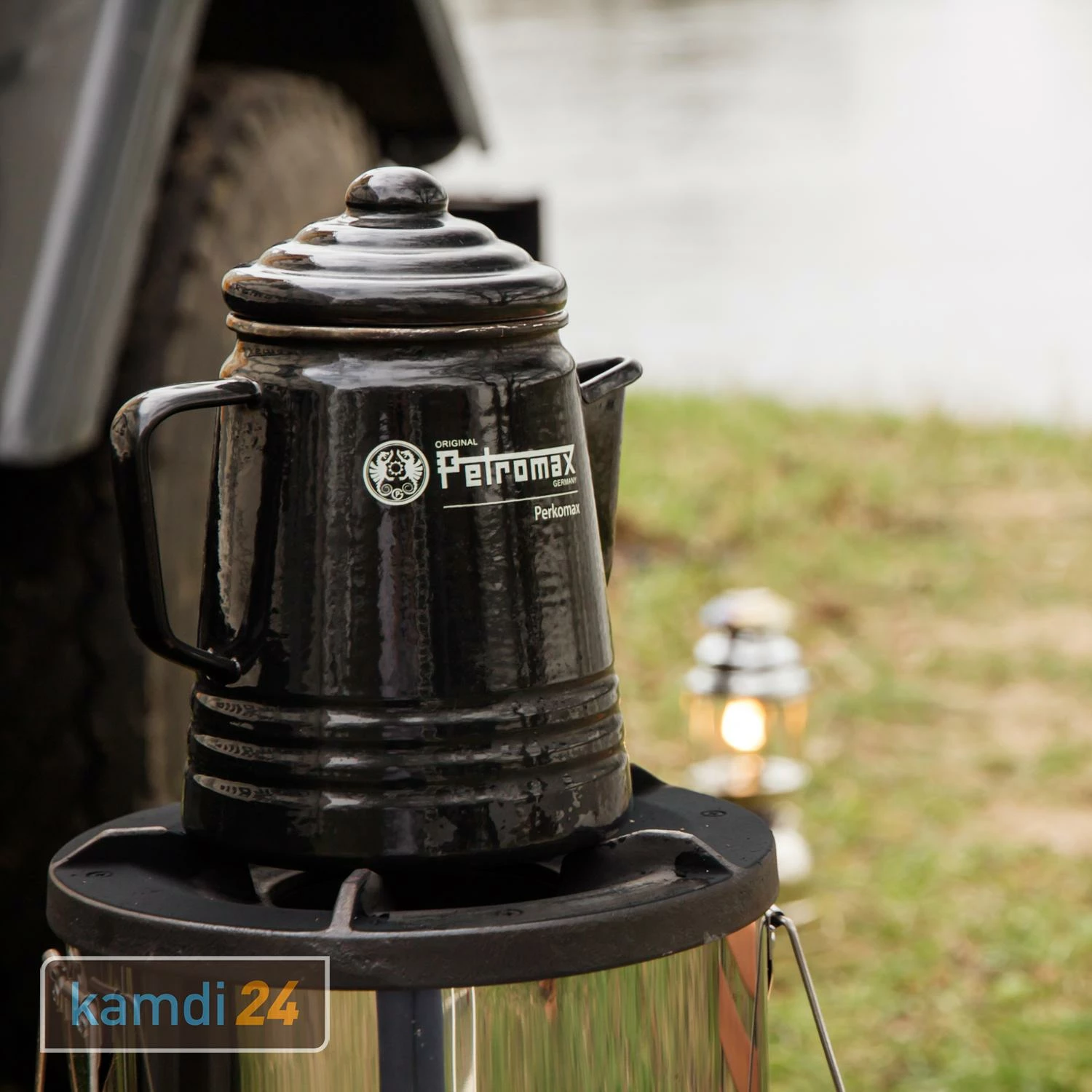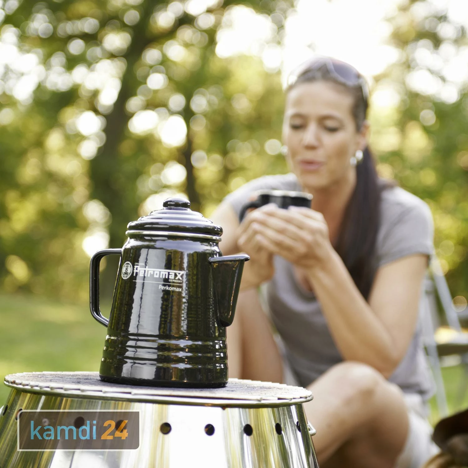 Guter Kaffee, egal wohin die Reise geht – das kann der von . Der robuste Kessel aus fasst 1,3 Liter und brüht aromatischen Kaffee oder auch Tee nach dem Perkolationsprinzip: Wenn das Wasser in der zu kochen beginnt, wird es durch den entstandenen Druck durch ein Röhrchen nach oben gepresst, tropft auf das Kaffeepulver bzw. den Tee im Sieb und läuft langsam durch. Unten angekommen, mischt es sich wieder mit dem verbliebenen Wasser und der Prozess beginnt erneut. Je länger das Wasser auf diese Weise zirkuliert, desto intensiver wird der Geschmack von Kaffee oder Tee. Petromax empfiehlt 12 bis 15 Minuten Kochzeit.