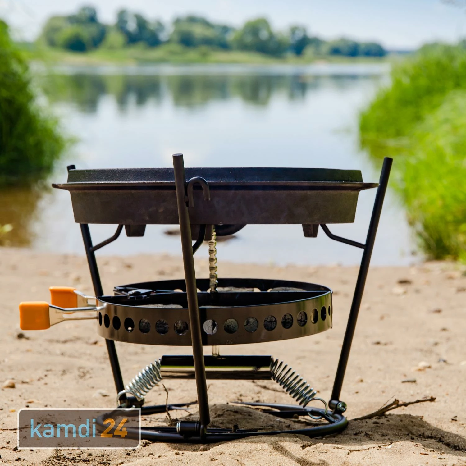 Das von vereint zahlreiche nützliche Funktionen beim Outdoor Cooking mit oder ohne Feuertopf. Es besteht aus dem , der und dem passenden . Gemeinsam bilden die drei Elemente einen mobilen , der sich im Handumdrehen aufbauen und platzsparend transportieren lässt. Anstelle des Grillrostes können Sie an der Oberseite auch den Deckel eines Feuertopfes (ab Größe 6) einspannen und diesen als Grillplatte verwenden. Da die Kohleschale über einen Klemmmechanismus befestigt wird, kann sie in beliebiger Höhe unter dem Grillrost bzw. der Grillplatte angebracht werden, wodurch Sie die Hitze unkompliziert regulieren können.