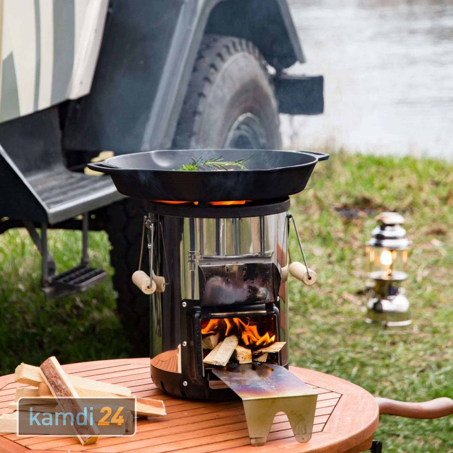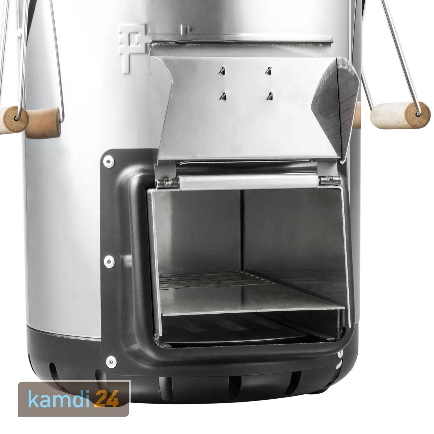 Der von weist die für Raketenöfen typische auf, die eine effiziente Verbrennung bei komfortablem Brennstoff-Nachlegen ermöglicht. Er ist die perfekte Ergänzung für jede Outdoor-Küche. Die zylinderförmige aus Edelstahl verfügt über einen , auf welchem Sie platzieren können. Das Geschirr sollte einen Bodendurchmesser von mindestens 12 cm aufweisen.