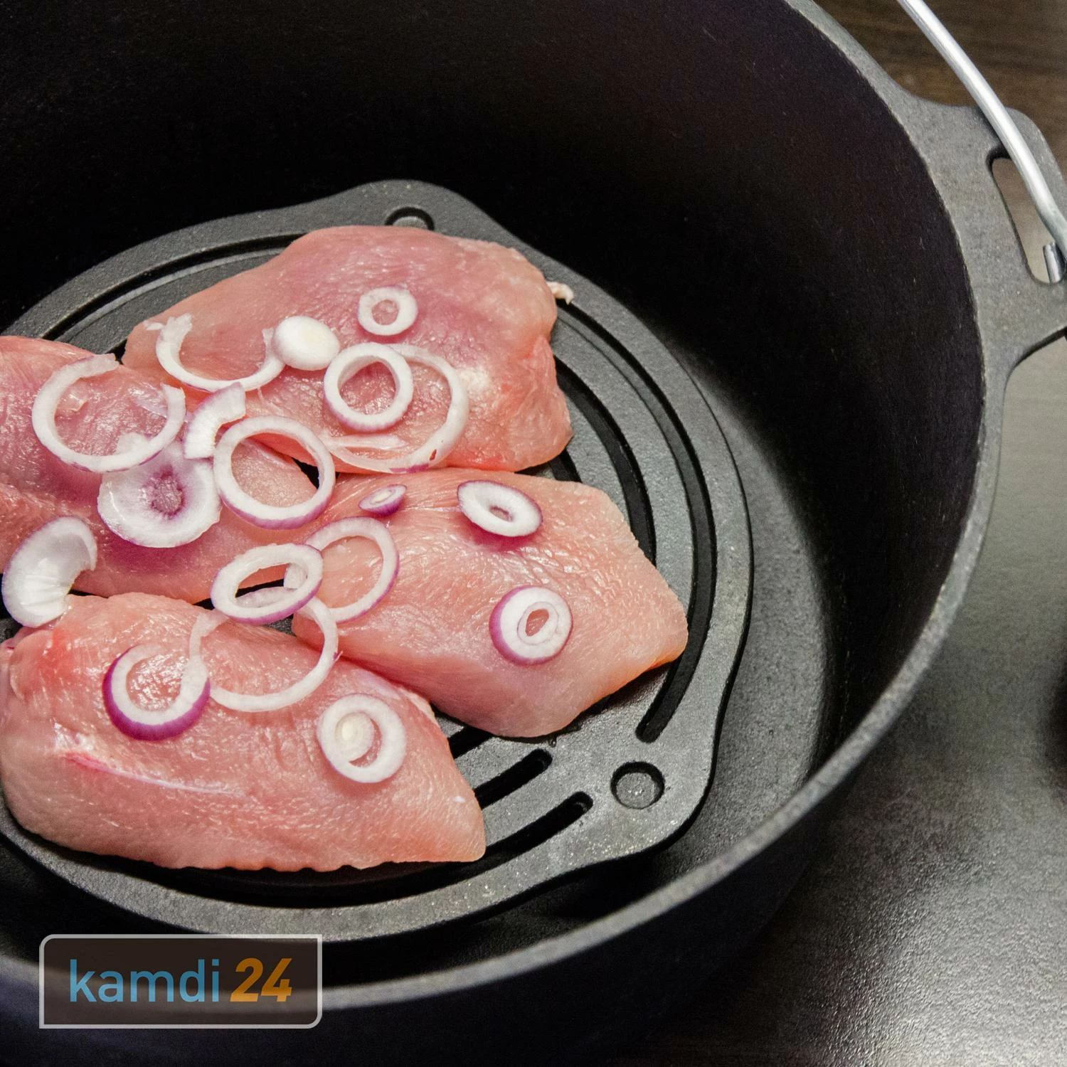 Der von nimmt beim Outdoor Cooking verschiedene Rollen ein: Wenn Sie den Rost platzieren, können Sie darauf backen oder Grillgut dünsten, ohne dass etwas anbrennt. Der Gussrost steht auf und kann somit auch über glühenden Kohlen als normaler verwendet werden. Die hervorragende Wärmeleitfähigkeit des Gusseisens sorgt hierbei für ein tolles Branding! Drei Aussparungen an der Oberseite machen den : So wird Grillen und Dünsten in mehreren Ebenen möglich, ohne dass die oberen Roste wegrutschen können.