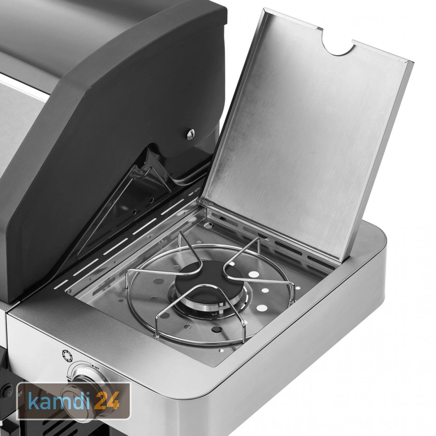 Nutzen Sie den integrierten Seitenbrenner mit einer Leistung von 3 kW zur Zubereitung von Soßen oder Beilagen. Im geschlossenen Zustand dient der Seitenbrenner als praktischer Ablagetisch.