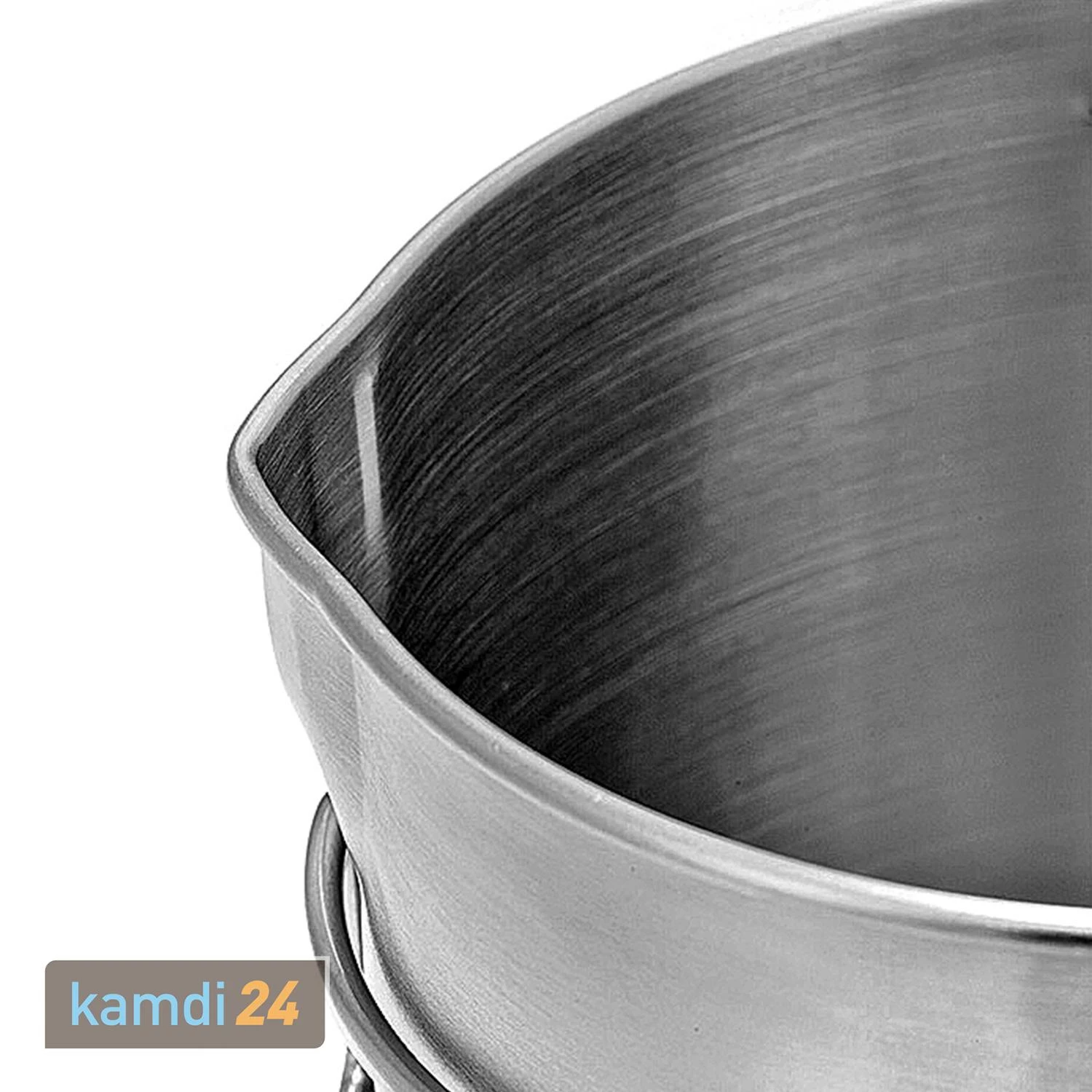 Dank eines ist der Deckel beim Kochen problemlos abnehmbar. Mit dem lässt sich der Topf auch an einem über einer Feuerstelle verwenden. Außerdem verfügt er über zwei Griffe an der Seite und eine Ausgießhilfe. Außen wie innen sind die in Unzen (oz) und Millilitern angegeben.