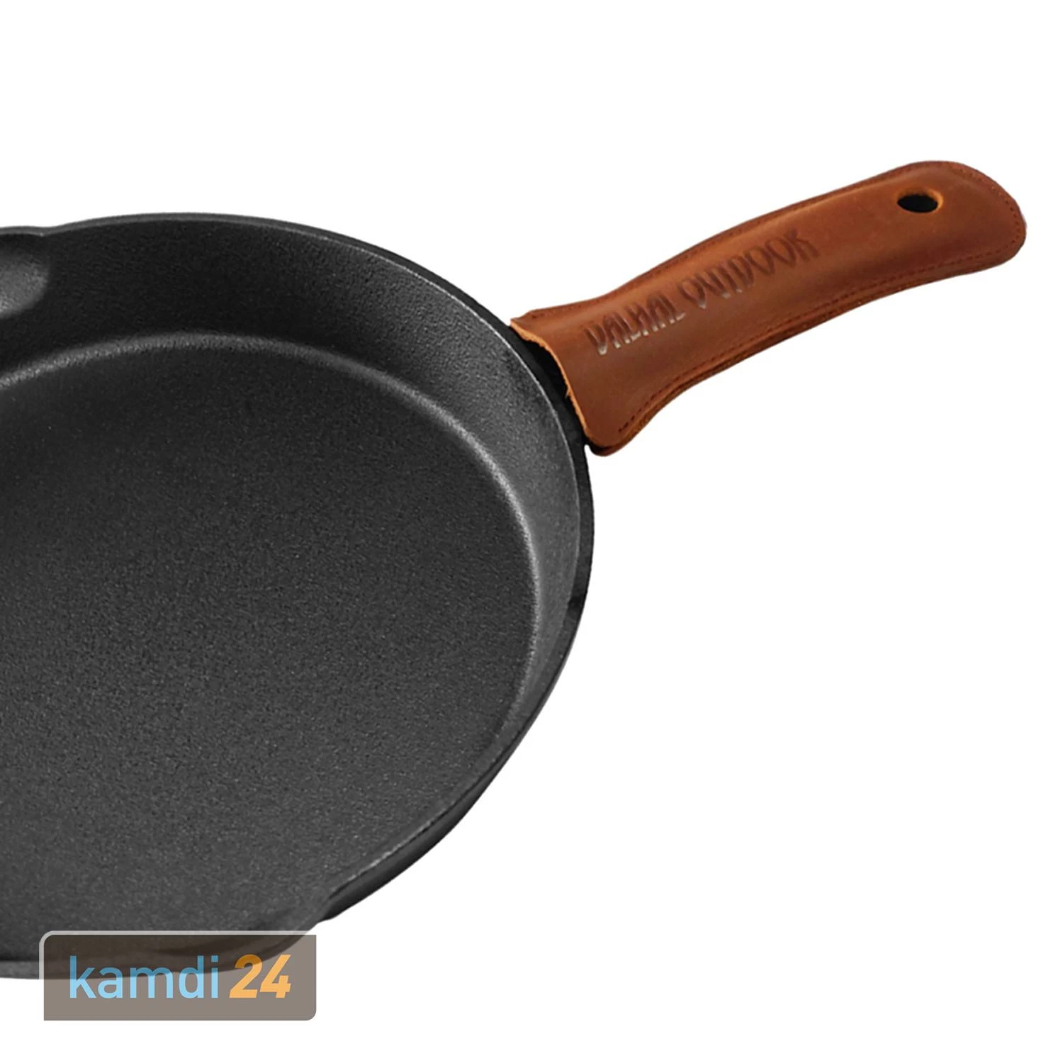 Die von aus Leder kann über den Stiel der Feuerpfanne gestülpt werden und dient als effektiver Schutz vor Verbrennungen, da sich Gusseisen stark erhitzt. Nach der Reinigung der Pfanne kann die Griffhülle zur Aufbewahrung wieder über den Stiel gezogen werden. Ein Loch in der Hülle ermöglicht es, die Pfanne auch mit Hülle an einem Haken aufzuhängen.