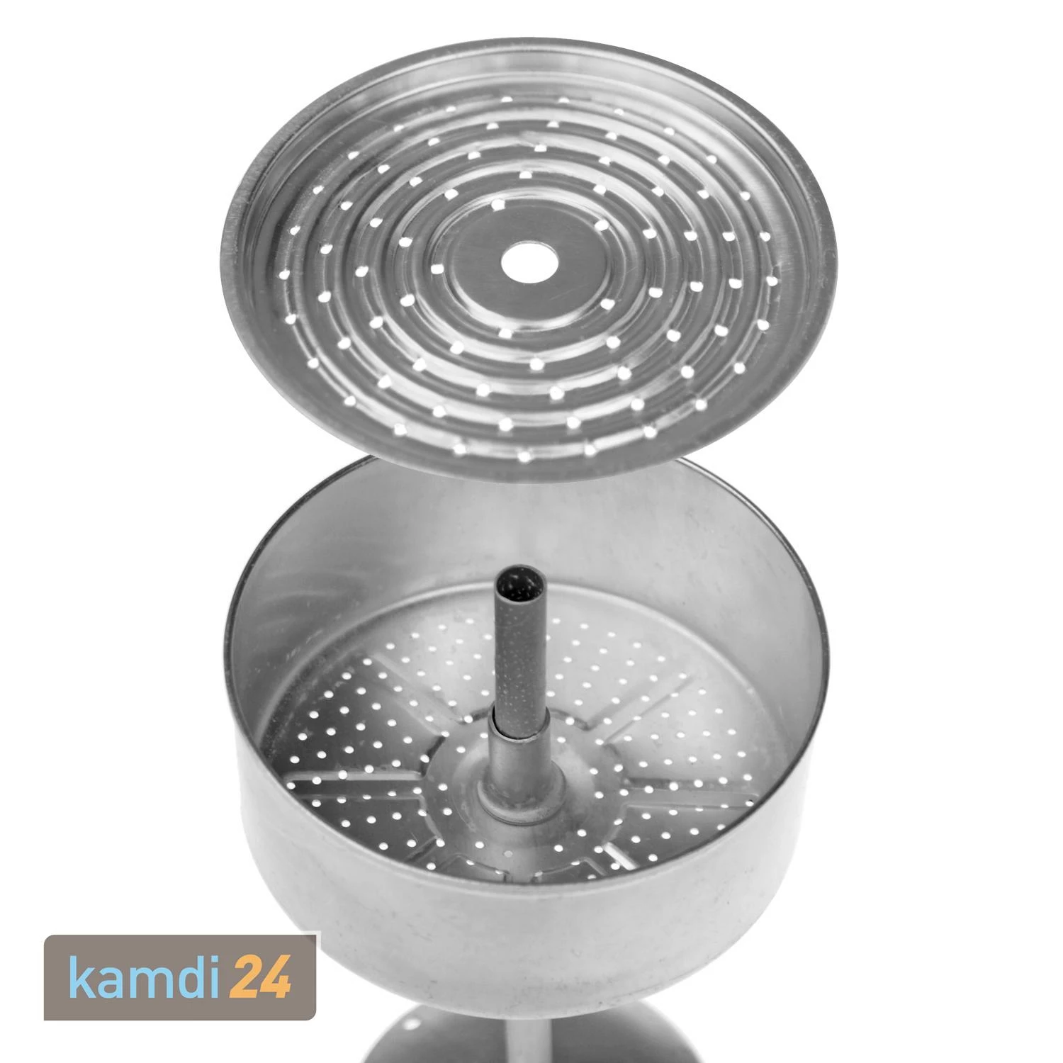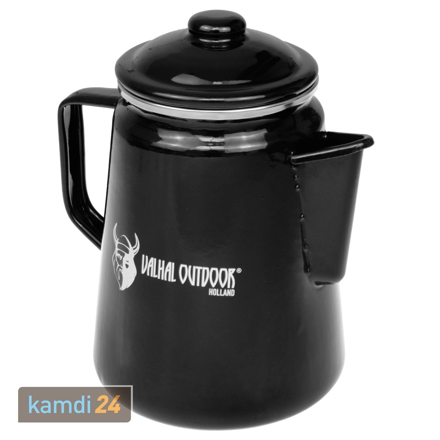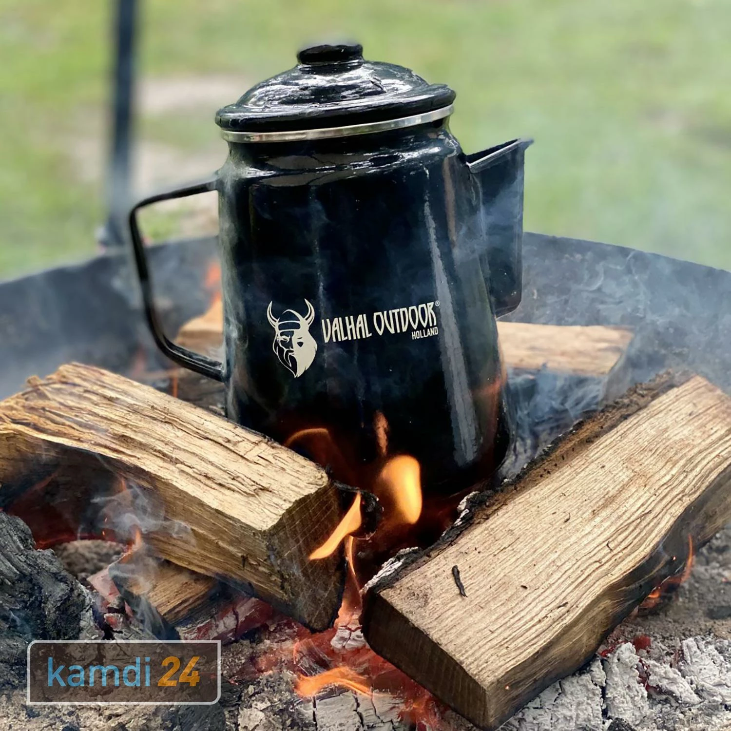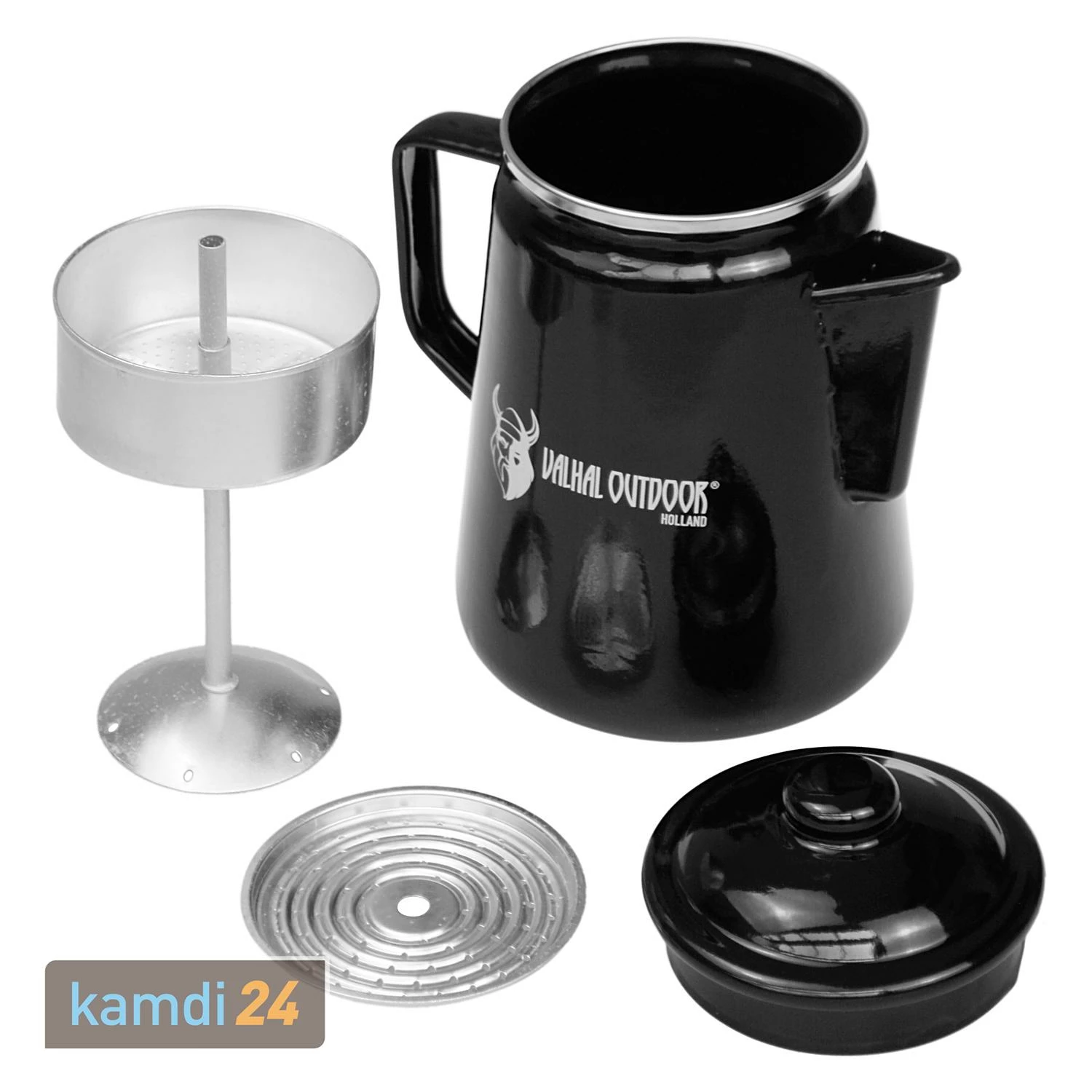 Der kann sowohl über dem Lagerfeuer oder der heißen Glut als auch auf dem heimischen Herd zum Einsatz kommen. Der Griff ist so groß gestaltet, dass er auch beim Tragen von hitzebeständigen Grillhandschuhen umfasst werden kann. Mit dem Perkolator von Valhal Outdoor können Sie 1,7 L bzw. etwa 6 Tassen Kaffee oder Tee zubereiten.