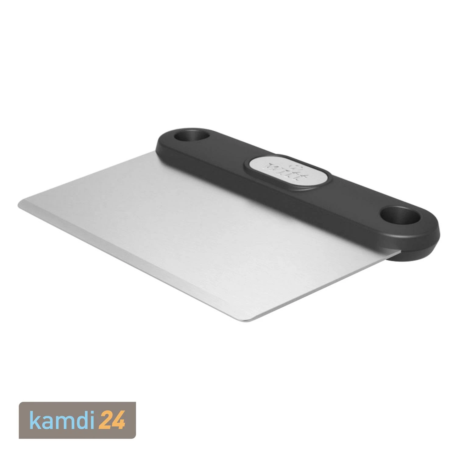 Hergestellt ist die Klinge des Teigschabers ; der Griff des Werkzeugs besteht aus schwarzem Kunststoff.